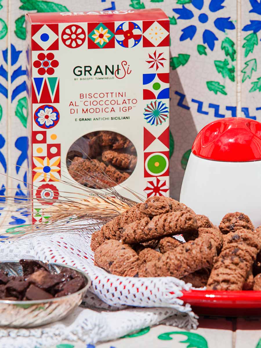 L’originale “Cioccolato di Modica IGP” fondente mescolato con lo zucchero di canna integrale biologico mascobado, sposa i grani antichi siciliani Tumminia e Maiorca.