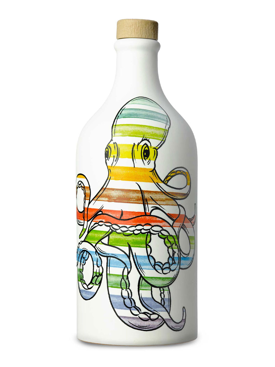 Terra e Mare. Colore e purezza. L’orcio in ceramica Polpo, prodotto a mano dai nostri artigiani pugliesi, è pop. È arte che si versa. custodisce tutti i profumi e il sapore del nostro olio extra vergine di oliva.