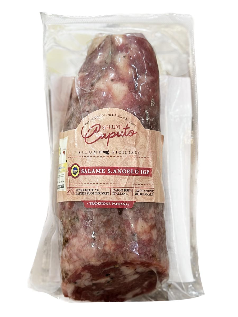 Unico salume siciliano a possedere il prestigioso marchio IGP, è un tesoro che si tramanda da oltre 70 anni nella famiglia Caputo, prima azienda produttrice del Salame S. Angelo I.G.P., secondo l’antica ricetta della tradizione, con la caratteristica tecnica norcina del taglio a punta di coltello, miscelazione con sale e pepe nero a mezza grana, budello naturale di suino e lenta stagionatura dai 30 ai 90 giorni.